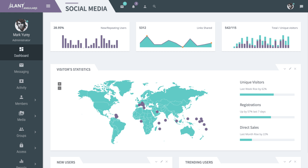 Slant Admin is created developer-friendly. This template contains different blanks. Among its sections, we can find Dashboard, APPS, User Interface, Forms, Charts, etc. For UI content, there are many elements starting with Typography, Progress Bars, Icons, and ending with Image Cropper, Section Panels, Counter Tiles. There are also many pages, such as the Login page, Forgot password page, Error pages.