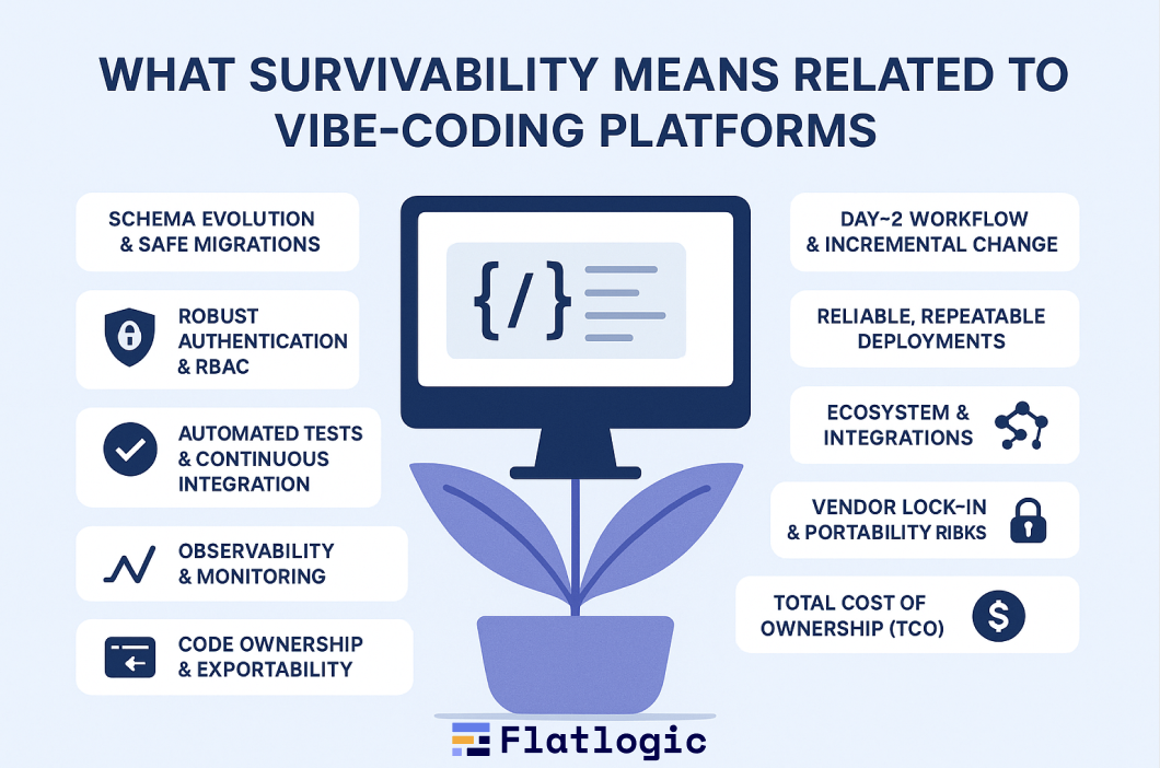 In vibe‑coding, building an MVP is no longer the hard part – the hard part is what happens after the applause. “Survivability” means that a platform’s output can live, evolve, and scale beyond the first sprint. It’s the difference between a viral demo and a reliable business system.