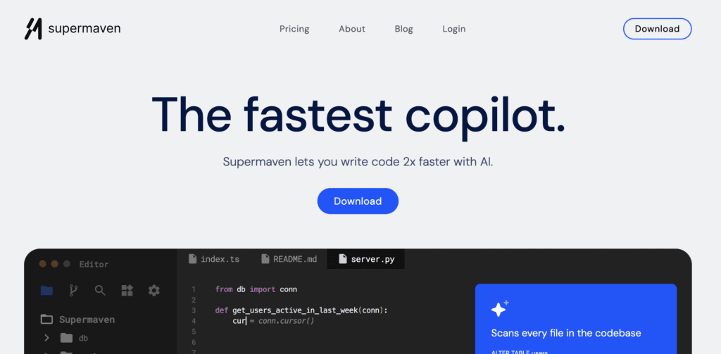 Supermaven provides an advanced AI-driven coding assistant embedded directly into popular IDEs such as VS Code and JetBrains. Its standout feature is its large context window, capable of comprehending and suggesting code changes across large codebases. Supermaven effectively boosts individual developer productivity with smart code completion, refactoring assistance, and real-time suggestions. However, it doesn’t natively offer scaffolding for complete applications, built-in deployment, schema migrations, or role-based access control management. Consequently, it’s ideal as a productivity-enhancing tool rather than a standalone platform for production-ready, full-stack applications.