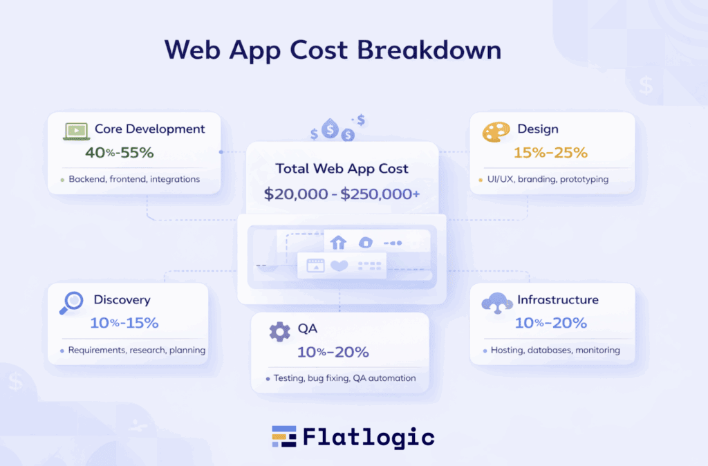When estimating a web app budget, most founders focus almost entirely on development. But writing code is only one part of the total cost. In reality, a significant portion of your budget goes to activities that happen before, around, and after development, and overlooking them is one of the main reasons projects go over budget.