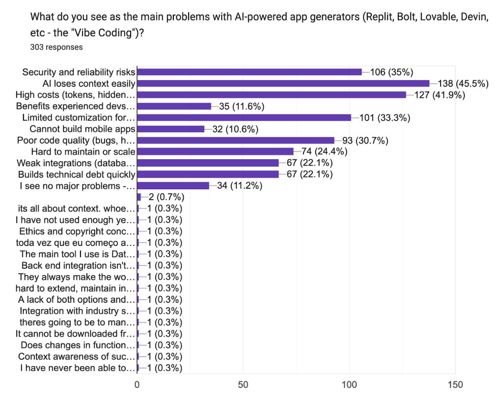 • Security & Reliability Concerns (35%): Worries about vulnerabilities or flaws inherent in generated code.