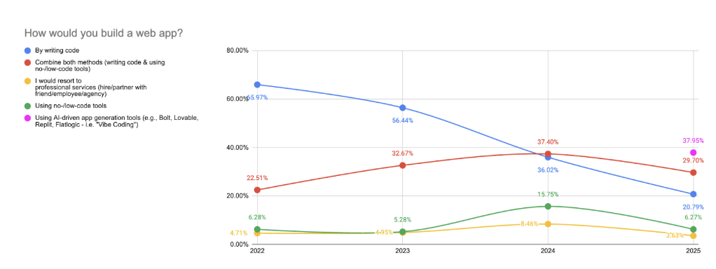 The study reveals that the share of web applications built entirely by hand has plunged significantly, from 65.9% in 2022 to just 20.8% in 2025. This striking decrease underscores a fundamental shift away from manual coding towards more efficient, AI-driven development methods.