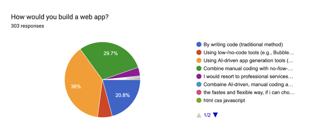 For the first time, AI-powered app generators, such as Flatlogic, Bolt.new, and Lovable, have become the most common starting point for new web apps, accounting for 38% of all projects. Additionally, 29.7% of respondents indicated they use a hybrid approach, combining AI-generated code with manual customizations. Notably, traditional low-code/no-code platforms have dramatically fallen in popularity, now representing only 6.3% of web app starts.