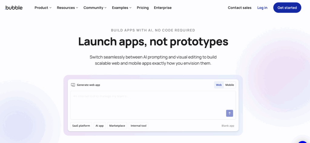 Bubble is a no-code web app builder enhanced with AI-assisted guidance, allowing users to define applications through semi-conversational flows combined with visual editors.