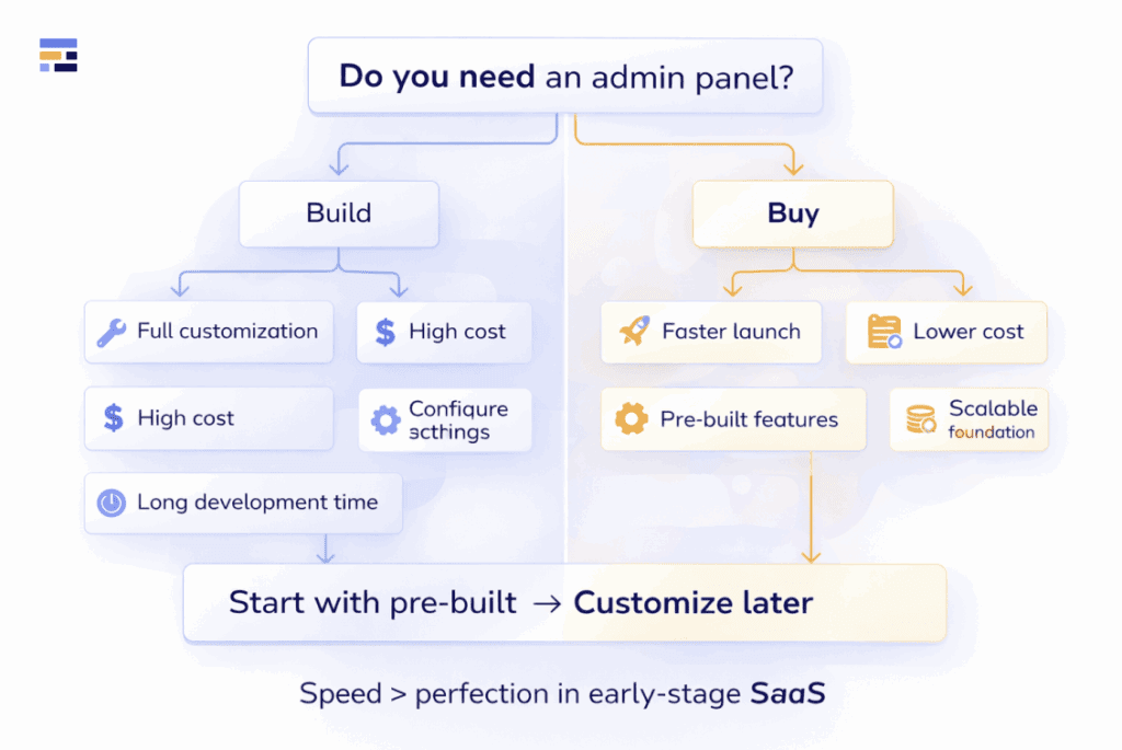 For most startups and SMBs, the practical approach is to start with a pre-built solution to save time and resources, and only consider building a custom admin panel later when your needs become more complex and clearly defined.
