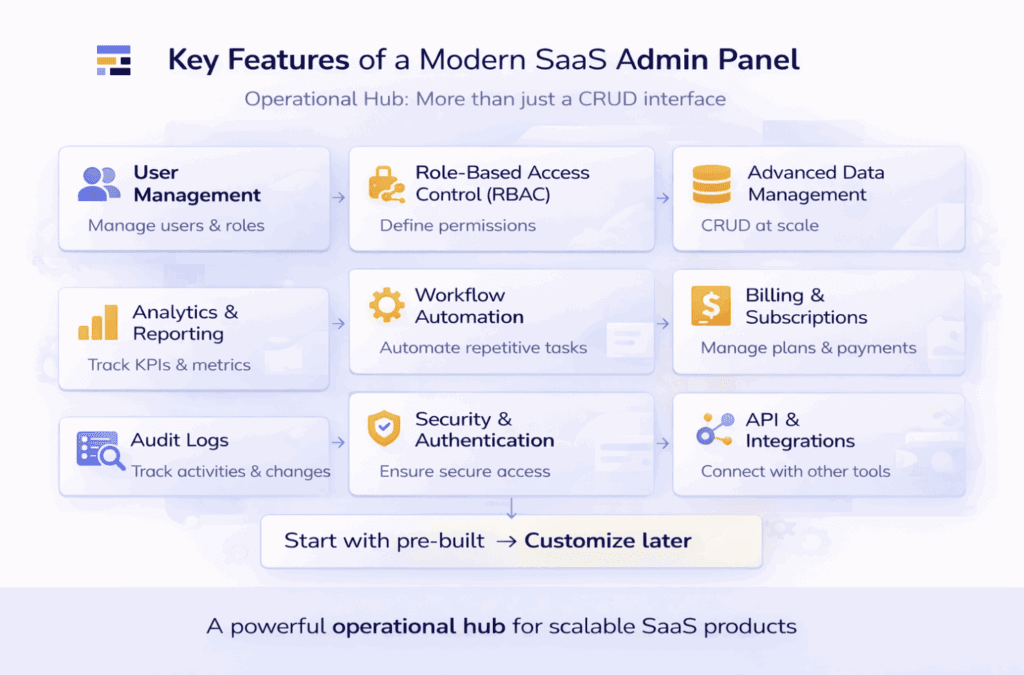 • Modern admin panels go beyond CRUD with RBAC, analytics, automation, audit logs, integrations, and strong security.