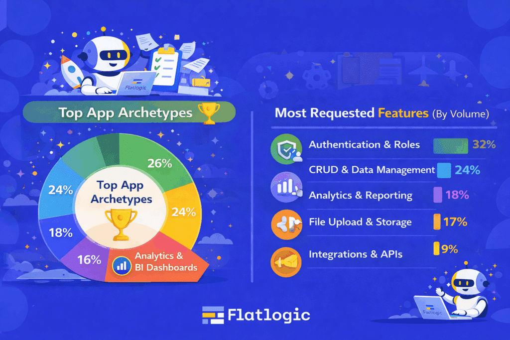 What follows is a breakdown of the most popular app archetypes and requested features based purely on actual user activity inside Flatlogic. No surveys. No interpretation filtered through marketing narratives. Just what people actually did when they needed software to exist.