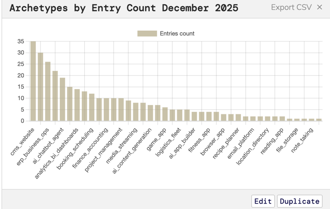 The most common archetypes were CMS and web admin tools, ERP-style business applications, AI-powered apps, internal dashboards, and analytics or BI systems. These are not experimental categories. They are the operational backbone of modern organizations.