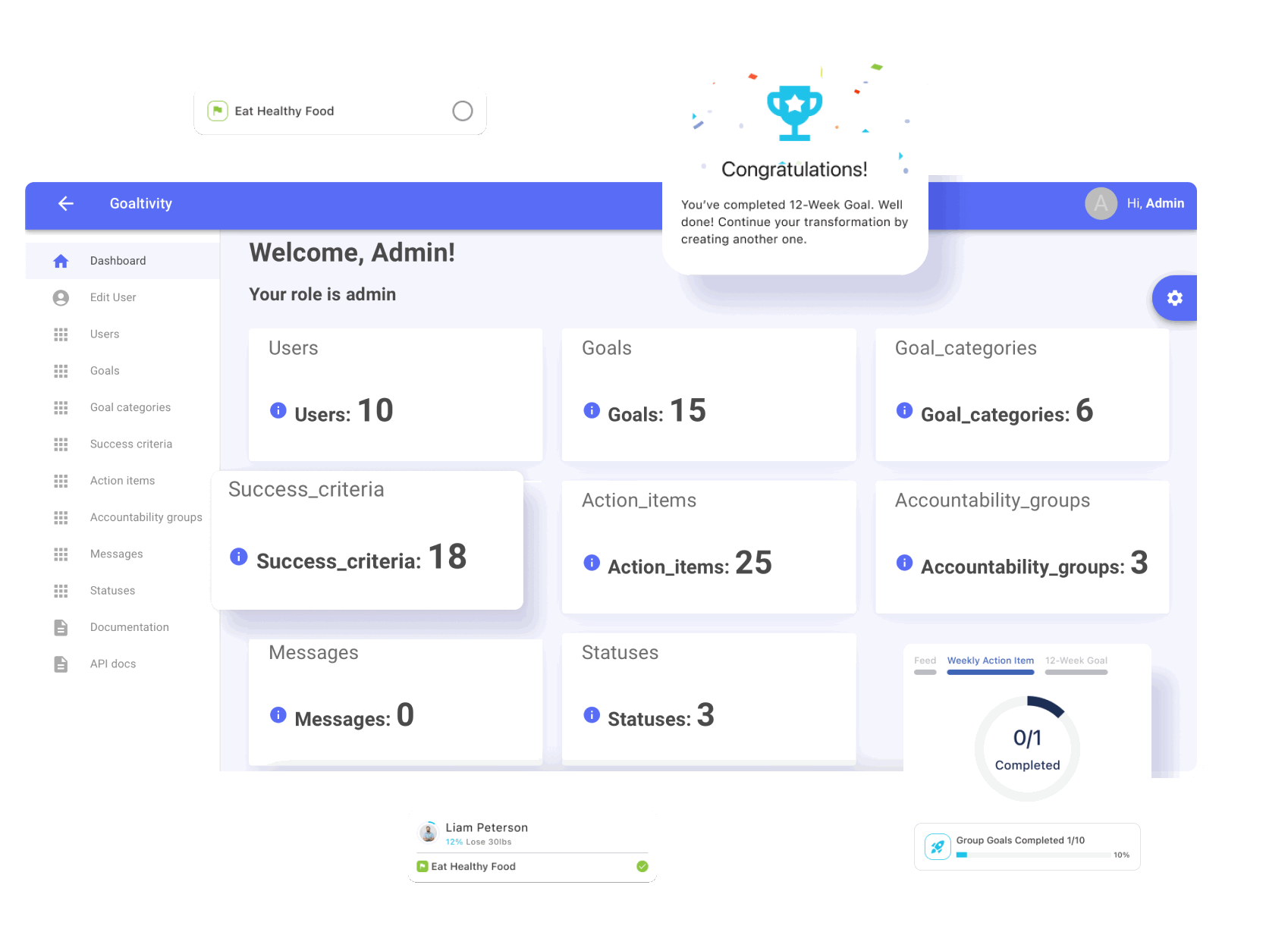 The objective of the Goaltivity MVP is to pair users with a like-minded accountability group to dramatically boost goal achievement, built-in timelines to help keep users on track, and measurement of progress that will allow users to keep momentum to goal completion.