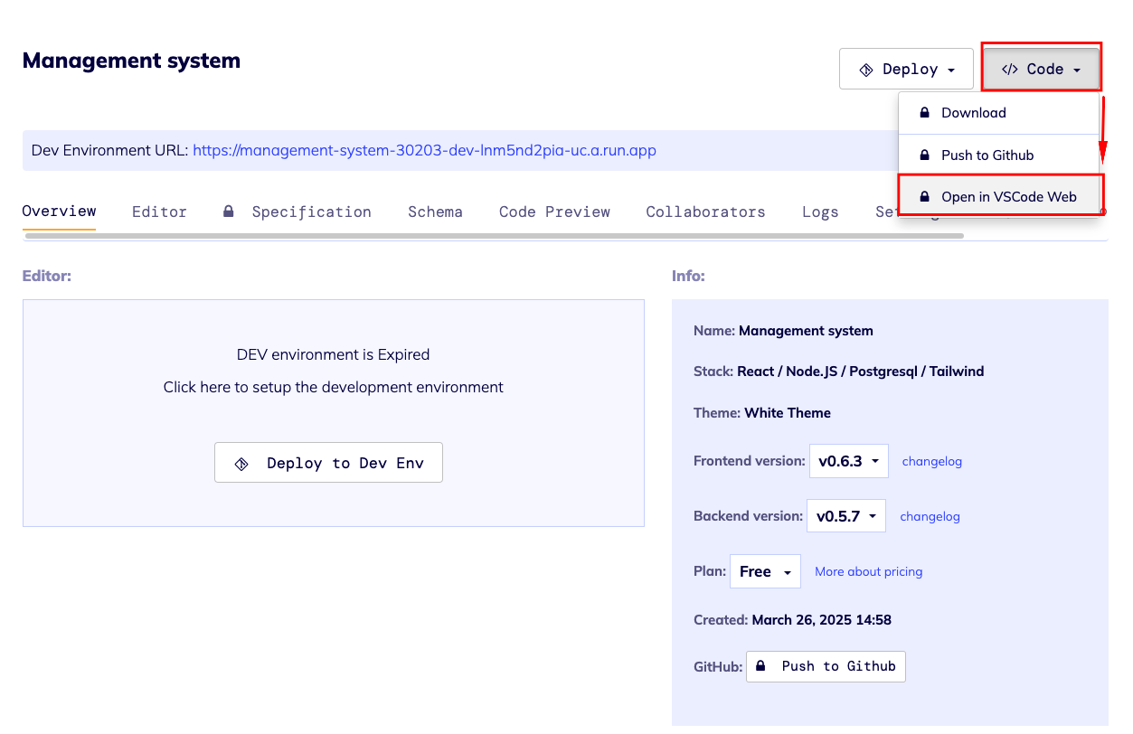 Additionally, users can directly edit the code in the VSCode Web editor. To do this, click the "Code" button in the top right corner and select "Open in VSCode Web."
