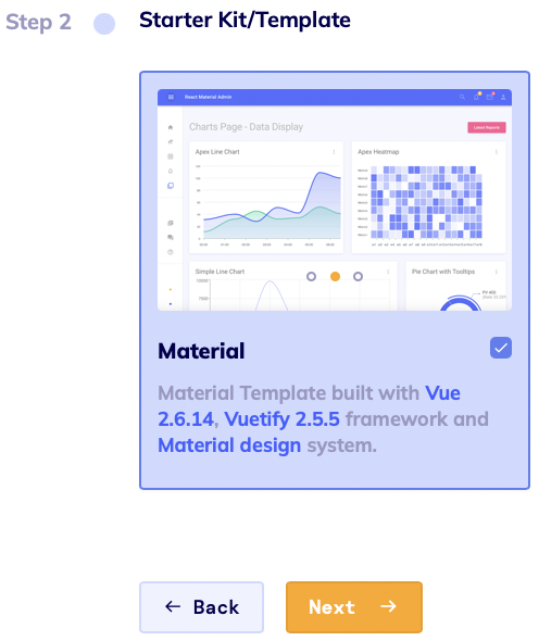 Firstly you need to choose the frontend, for our guide we choose Vue as the front.